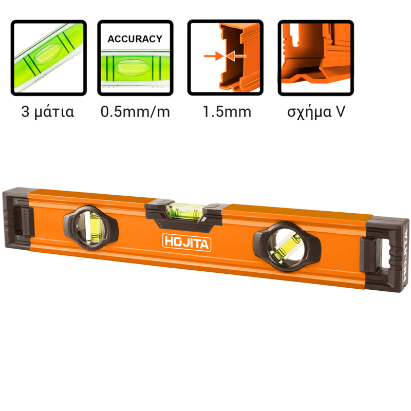 >Υλικό: Αλουμίνιο >Ακρίβεια αμπούλας: 0,5mm/m >Πάχος αλουμινίου: 1,5mm >Αντιολισθητικό περίβλημα 3 μάτια υψηλής ευκρίνειας >Σχήμα V: Μέτρηση σε οριζόντια, κάθετη, 45°και σε στρογγυλές επιφάνειες >Μήκος: 80cm > >