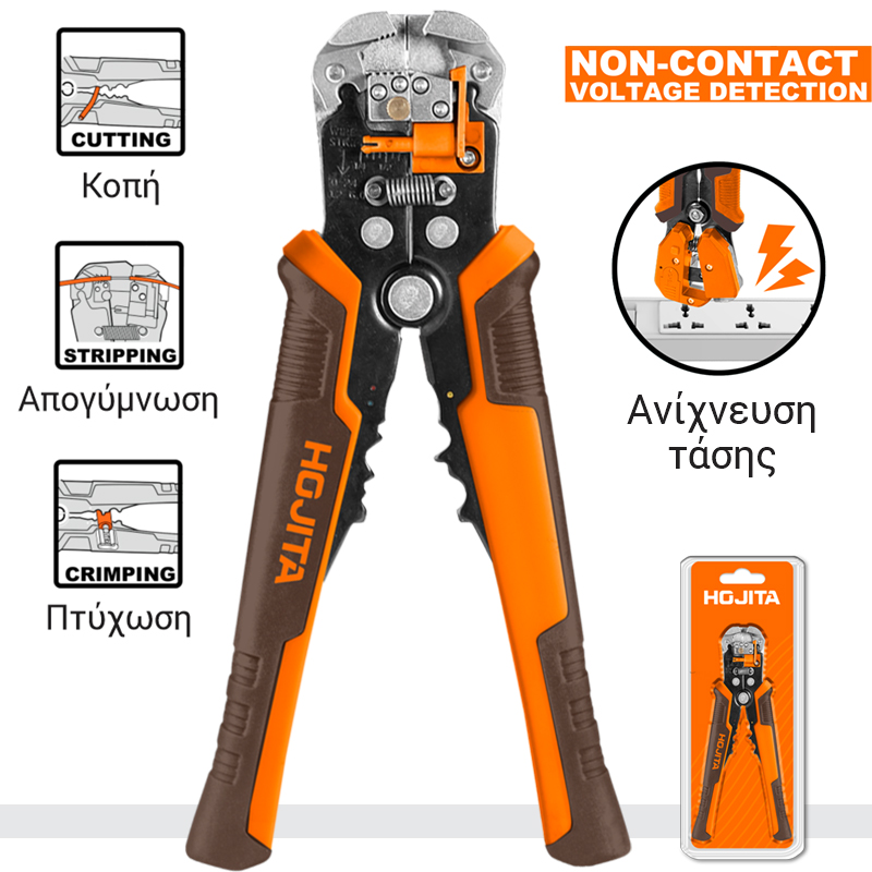 >Μέγεθος: 210mm >Λαβή: Εργονομικές λαβές με απελευθέρωση ελατηρίου. >Πιστοποίηση: VDE 1000V >NCV: Ανιχνευτής τάσης άνευ επαφής. >Απογύμνωση, κοπή και πρεσάρισμα καλωδίων. >Ικανότητα απογύμνωσης: 0.2 - 6mm². >Ρυθμιζόμενο μήκος απογύμνωσης 6 - 10mm. >Ικανότητα πρεσαρίσματος: 0.5 - 6mm². >Μήκος πρεσαρίσματος: 7-8mm. >Με ένδειξη LED >Κατάλληλος για σύρματα χαλκού και αλουμινίου. >Περιεχόμενα συσκευασίας: 2 τεμ. 1.5V LR44 αλκαλικές μπαταρίες.