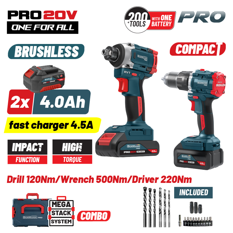 Κρουστικό Δραπανοκατσάβιδο• Τάση: 20V (Li-Ion)• Τσοκ: 2-13mm/Αυτόματο Μεταλλικό• Ταχύτητα χωρίς φορτίο: 0-500/0-2000rpm• Μοτέρ Brushless: Ναι• Ρύθμιση ροπής: 20+1+1• Μέγιστη Ροπή(Nm): 120• Ταχύτητες: 2• Σύστημα απορρόφησης κραδασμών• Βάρος εργαλείου χωρίς μπαταρία(kg): 1.3• Φως εργασίας LEDΜπουλονόκλειδο/Παλμικό Κατσαβίδι • Τάση(V): 20 (Li-Ion) • Τσοκ: 1/2”, 1/4• Στροφές(rpm): 0-1900/2320/2650• Μοτέρ Brushless: Ναι• Ρυθμίσεις ροπής: 3• Μέγιστη Ροπή Μπουλονι/Βίδωμα(Nm): 500/220• Ισχύς κρούσης(bpm): 0-2320/2980/3500• Βάρος εργαλείου χωρίς μπαταρία(kg): 1.2• Μπαταρία (Ah): 2x4.0• Περιλαμβάνει: Φως εργασίας LED, ηλεκτρικό φρένο, 2x μπαταρίες 4.0Ah, γρήγορο φορτιστή 4.5A, 3x τρυπάνια μπετού 6,8,10 mm, 3x τρυπάνια σιδήρου 3,4,6 mm, αντάπτορα για μύτες, 10x μύτες, 3x καρυδάκια 17,19,21mm• Βάρος Συσκευασίας(kg):8• Διαστάσεις Συσκευασίας(kg):45.1x34.5x15.6*Σε έξυπνη Βαλίτσα MEGA STACK SYSTEM.