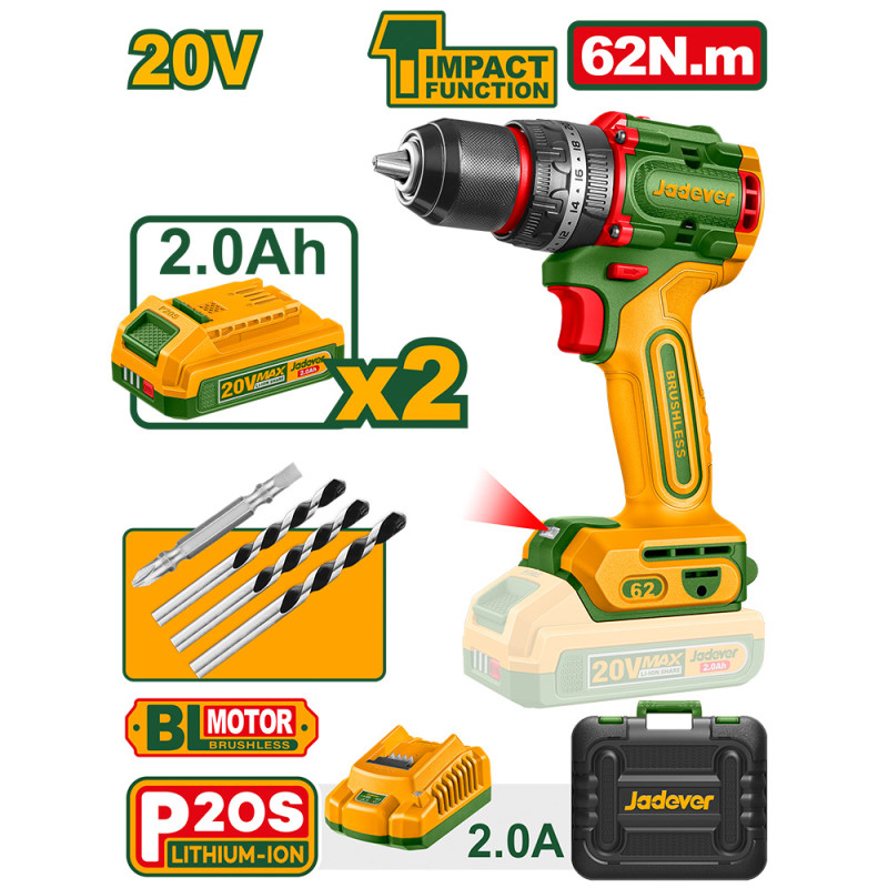 | Κινητήρας χωρίς ψήκτρες Τάση: 20V Ταχύτητα χωρίς φορτίο: 0-500/0-2000rpm Μέγιστος ρυθμός κρούσης: 30000bpm Μέγιστη ροπή: 62Nm Μεταλλικό τσοκ 13mm Ιδιότητες ροπής: 22+1+1 Μηχανικό κιβώτιο 2 ταχυτήτων Λειτουργία κλειδώματος άξονα Ενσωματωμένος φωτισμός εργασίας LED Ένδειξη ισχύος μπαταρίας LED Περιλαμβάνει: 1 μύτη Cr-V 3 διαμαντοτρύπανα 2 μπαταρίες 2,0 Ah (JDLBP520) 1 φορτιστή (JDFCP518) Τάση φόρτισης: 220-240 V ~ 50/60 Hz Συσκευασία σε βαλιτσάκι |