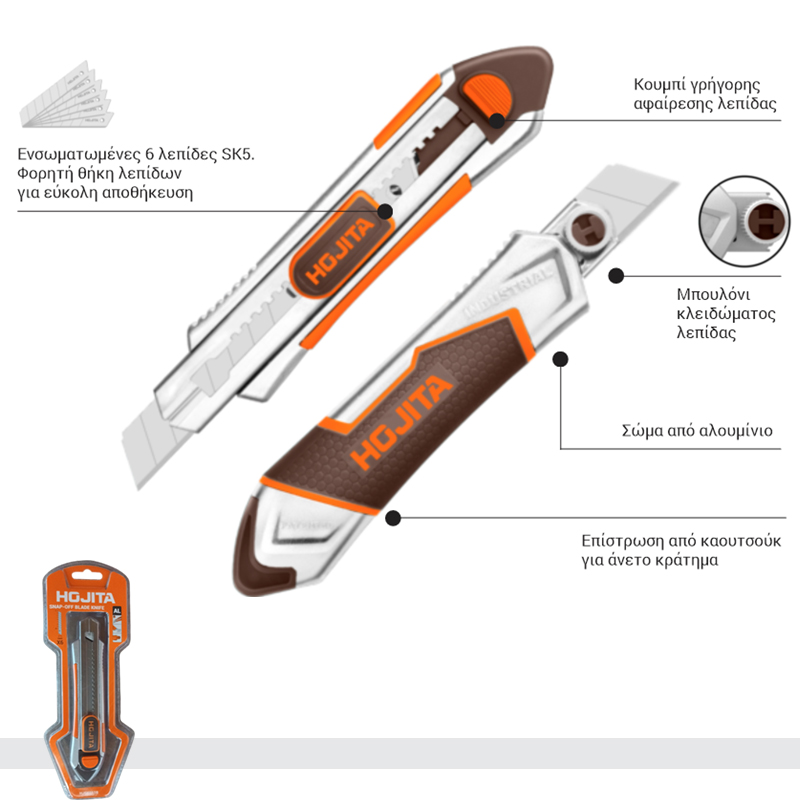 >Σώμα αλουμινίου >Μέγεθος λεπίδας: 18mm x 100mm >Μήκος: 185mm >Περιλαμβάνει 6 τεμάχια λεπίδων SK5 >Με βίδα κλειδώματος της λεπίδας >Με επίπεδο πλήκτρο πιέσεως >Καθαρό βάρος: 190g